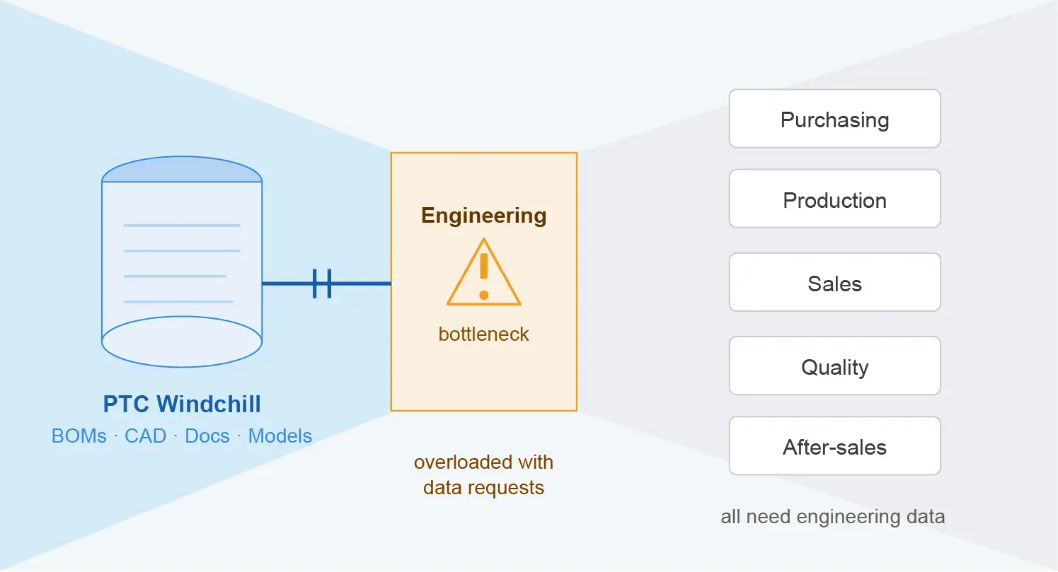 These requests are reasonable. The data exists. Windchill has it. But accessing it requires credentials, training, licenses, and a level of technical fluency that most people outside engineering simply do not have.